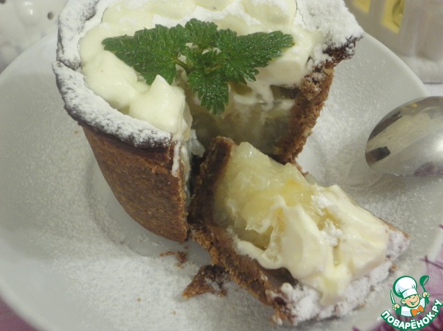 Отсадить сливки сверху на пирожные, присыпать сахарной пудрой и украсить листиками мяты.