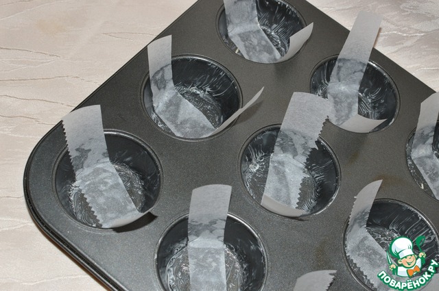 Разогрейте духовку до 180гр. Смажьте маслом форму для маффинов или маленькие формочки для кексов. Вырежьте из бумаги для выпечки полоски примерно 12 на 2,5 см и вставьте их в формочки, после выпечки вы сможете безпроблемно вынуть готовые тортики.
