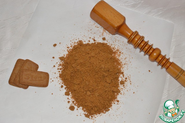 Измельчите печенье в кухонном комбайне или как я - положив его в пакет и поколотив чем-нибудь подходящим.