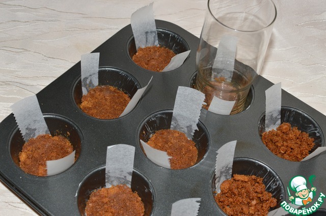 Растопите 50г сливочного масла и смешайте с крошкой из печенья. Разложите по 1,5 ч. л. с верхом в каждую формочку. Прижмите основу, с этим прекрасно справится стакан. Основа получится высотой примерно 1см.