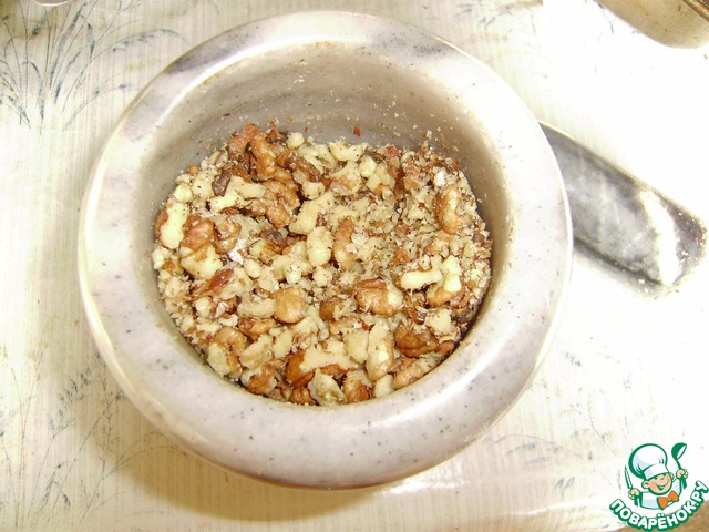 Орехи измельчить, чтоб остались небольшие кусочки.