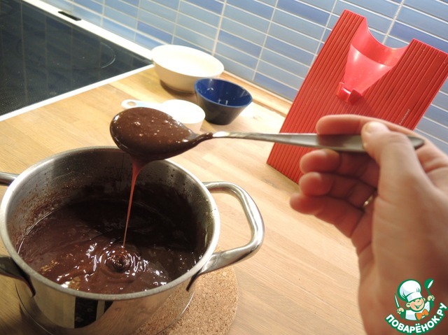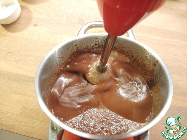 Теперь добавляем разломанный шоколад и перемешиваем блендером. Будьте очень-очень осторожны, температура масла 200 градусов, сами понимаете, повышенная опасность. Кастрюльку наклоняем от себя и на медленных оборотах, контролируя направление каждого булька, добиваемся однородной массы. Даем остыть, примерно 15 мин. Нужно, чтобы терпел палец, иначе свернутся яйца.