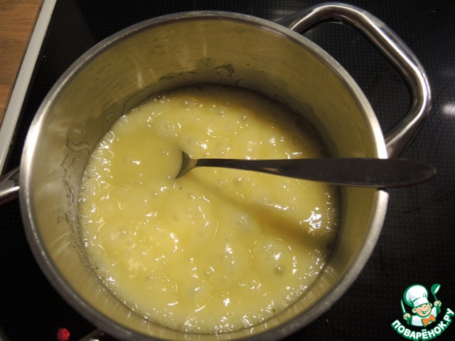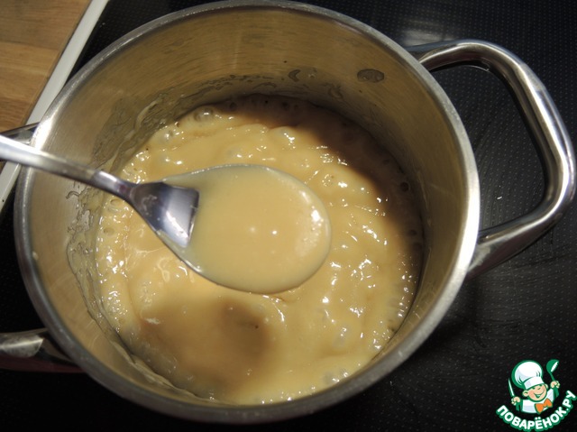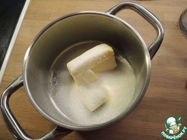 Растопить сливочное масло, добавить сахар и медленно помешивая до светло-коричневого цвета. Вот тут я когда делала, ошиблась в переводе, забабахала в кастрюлю вместе и масло и сахар. Потом, когда стала писать для сайта, поняла, но было поздно. Но, в следующий раз сделаю "по науке".