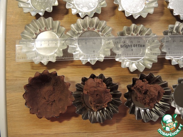 Разделяем тесто на количество формочек, и вдавливаем его туда. Я, как и писала, делала половину, потому что нашла только 18 формочек. Диаметр примерно 6 см. Вот, даже линейку приложила, чтобы было понятнее.
