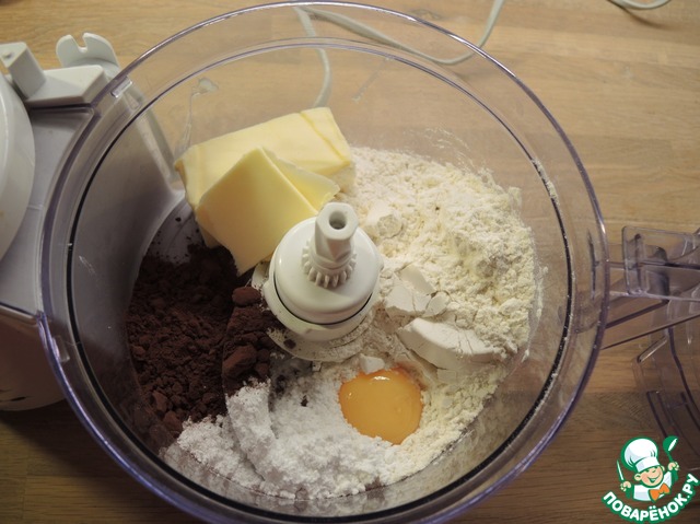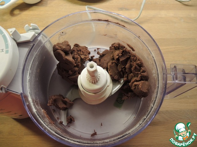 Смешать вместе масло, муку, сахарную пудру и какао. Я все поместила в кухонный комбайн, и через 1 мин получилось тесто.