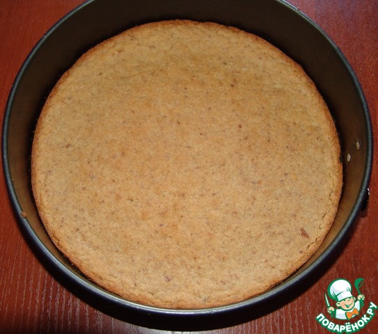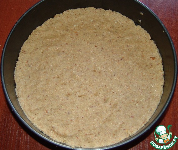 Духовку разогреть до 180 градусов. Печенье растолочь (счастлив тот, у кого есть блендер!), смешать с маслом. Выложить в форму, утрамбовать. Отправить в духовку на 10-15 минут.