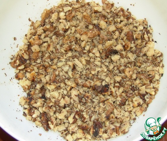 Орехи обжарить и крупно порубить.