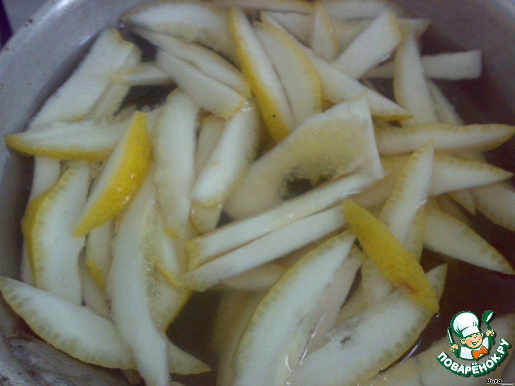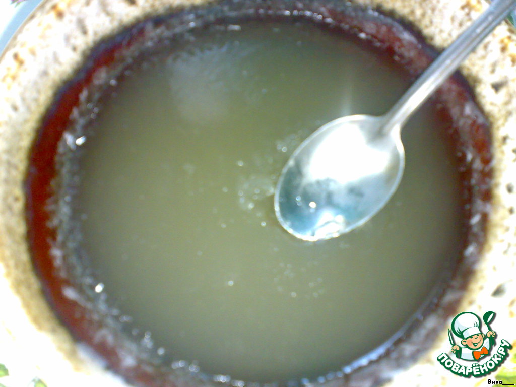 Воду с сахаром доводим до кипения, добавляем цедру лимона, после этого вводим желатин. После того, как желатин растворится, добавляем выжатый из лимонов сок.