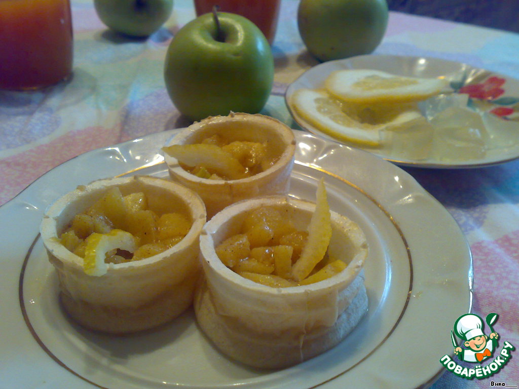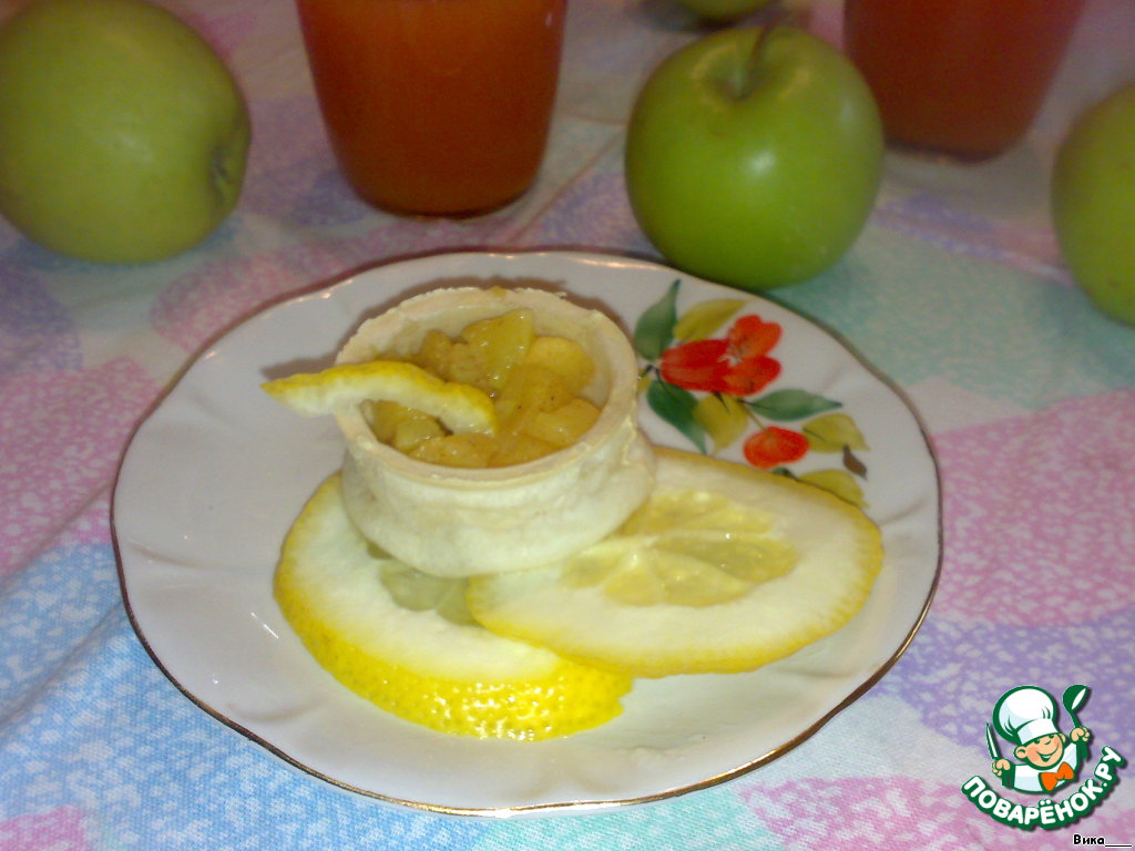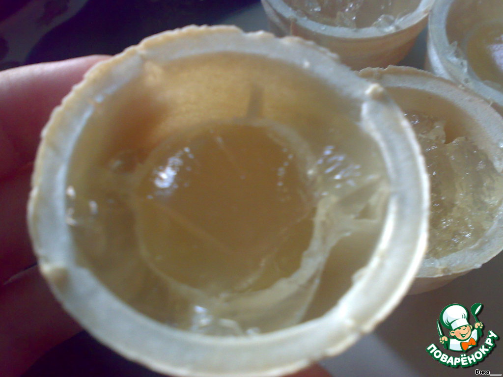 На дно корзиночек кладем застывшие желе, а наверх - яблоки.