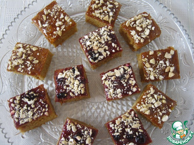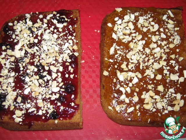 Разрезала корж на две половинки. Одну часть смазала смородиновым вареньем, другую-персиковым, посыпала орехами кешью.
