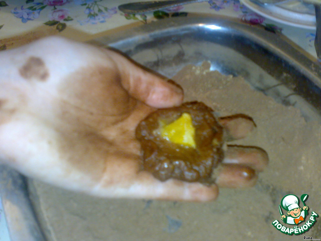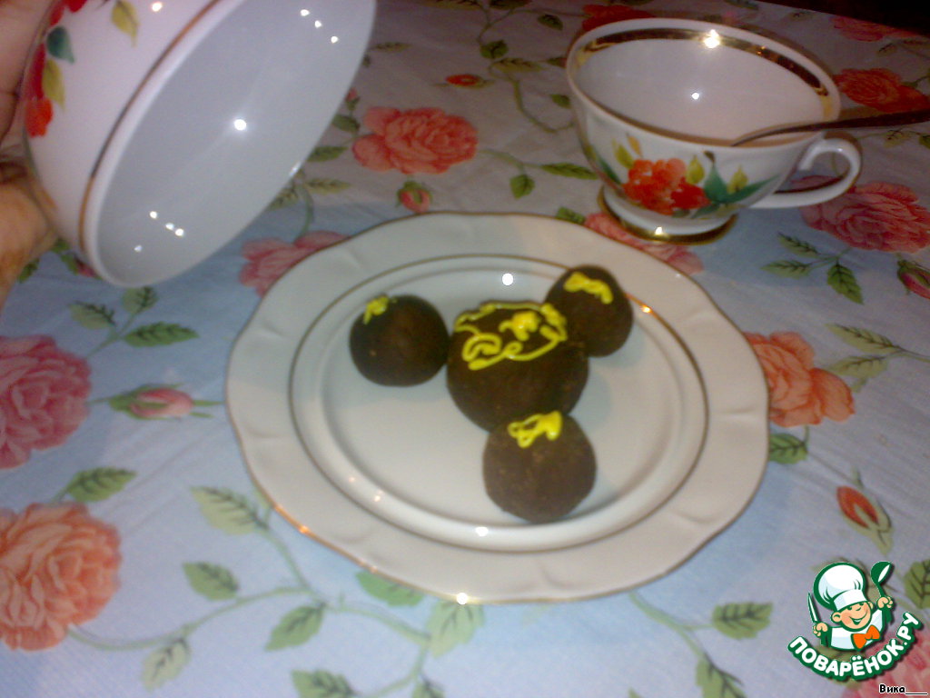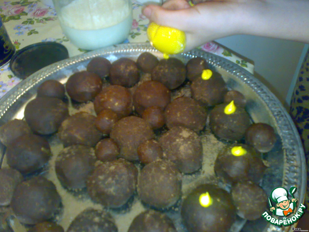 Из смеси печенья слепить небольшие шарики и начинить их кусочками апельсина, обвалять шарики в какао.