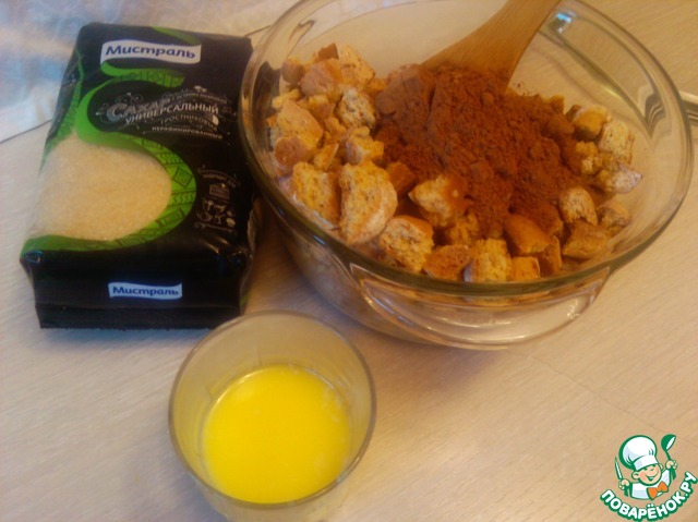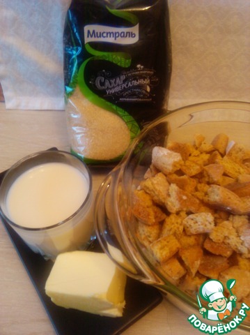 Итак берем печенье или сухари, ломаем его на кусочки или трем на терке, добавляем в него сахар "Мистраль" и заливаем кипящим молоком