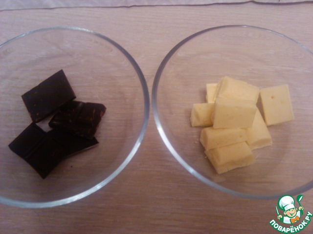 Теперь берем белый и темный шоколад, ломаем его на кусочки и топим на водяной бане