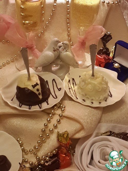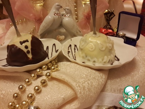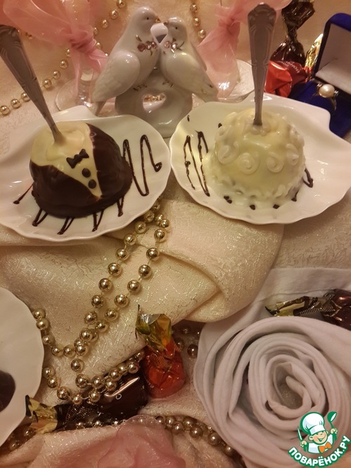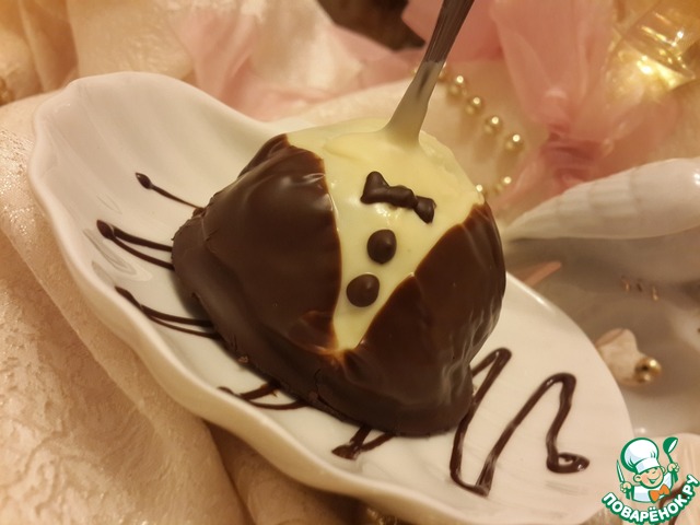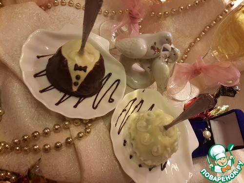 Для принца нужен темный шоколад. Аккуратно берем за ложечку пирожное и наклонив его макаем бочком в темный шоколад. Сначала один бок, потом другой. Из кулёчка также рисуем бабочку и пуговки на фраке