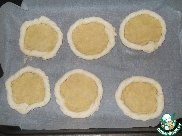 Тесто нарезаем на полоски длиной 20 см, шириной 2 см, растягиваем примерно до 30 см и скручиваем каждую полоску в жгут. Соединяем, формируя крендель (я делала в форме кольца). Кольца из теста выложить на противень, застеленный бумагой для выпечки. В середину колец насыпаем крошку и приминаем - получается донышко из крошки.