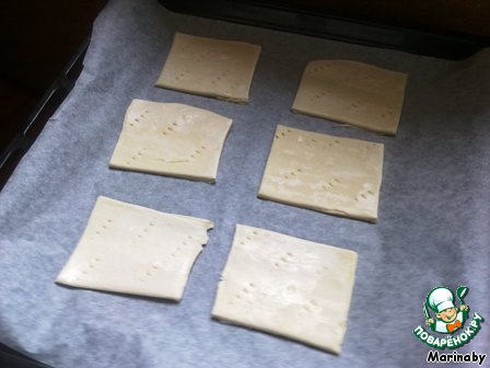 Противень немного смазать маслом или застелить бумагой для выпечки, выложить квадратики.Немножко посыпать сахарной пудрой. Поставить в разогретую духовку до 200 градусов на 10 минут.