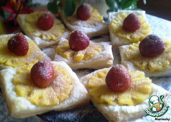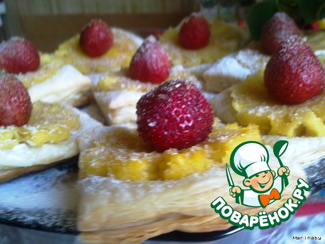 Готовые слойки украсить клубникой и посыпать пудрой.
