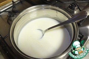 В небольшой кастрюльке растопить сливочное масло. В растопленное масло налить кефир, перемешать, снять с огня и добавить соду.