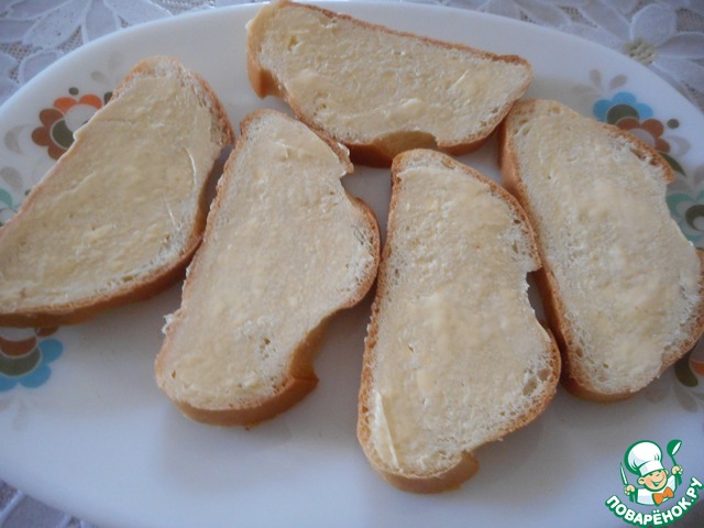 Нарежьте батон ломтиками толщиной 1 см и легонько смажьте их маслом.