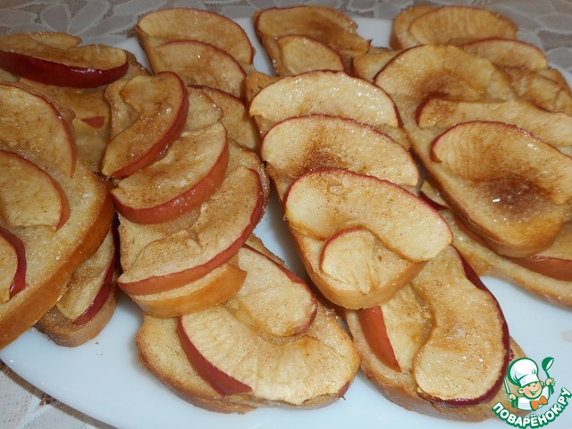Яблоки нарежьте тоненькими дольками толщиной 0,5 см и выложите их на хлеб.