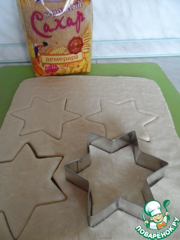 Предварительно размороженное при комнатной температуре тесто немного раскатать и формой для печенья вырезать звездочки.