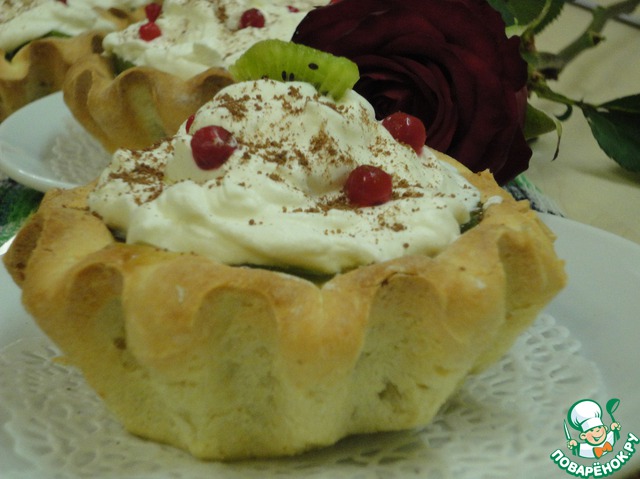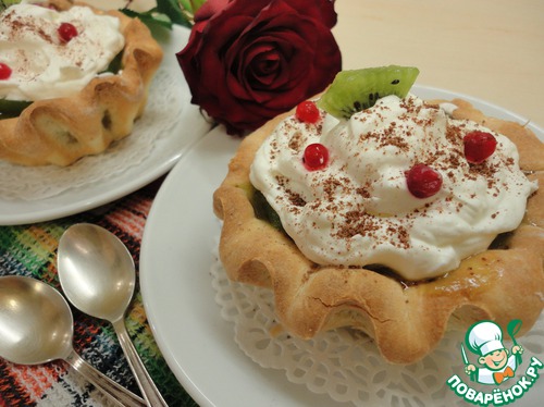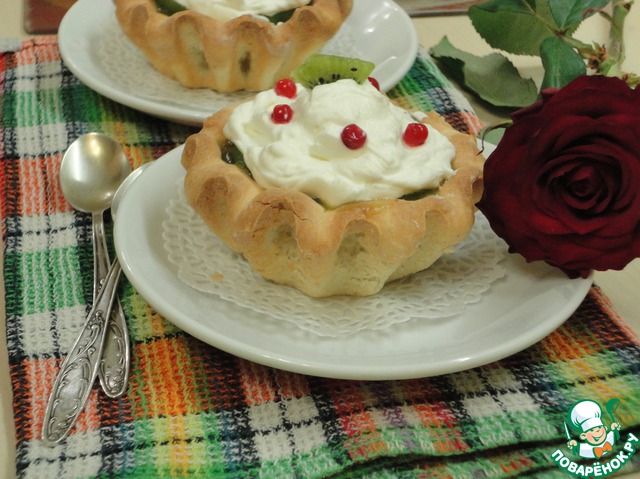 Перед подачей взбить сливки с сахарной пудрой. Выложить сверху на корзиночки. Украсить яркими ягодами и кусочками киви.