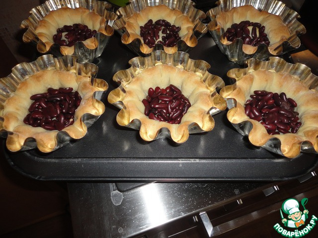 Включаем духовку на 180 гр. Раскатать тесто не больше 0,5 см. толщины. Выложить в формочки. Чтобы тесто не поднималось, застелите донышко бумагой и присыпьте сухой фасолью. Выпекать 20-25 мин. Вынуть из духовки и дать остыть в форме. Убрать фасоль.