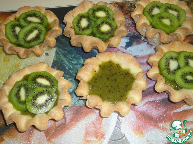 Оставшиеся киви нарезать тонкими кружками. Оставить 4 кружочка для украшения. Выложить ими поверхность корзиночек.