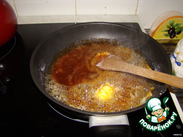 Сахар высыпаем на сухую сковородку и нагреваем на слабом огне пока сахар не начнет плавиться Мешаем и продолжаем нагревать сахар пока карамель не станет коричневого цвета