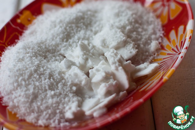Перемалываем кусочки кокоса в кухонном комбайне или натираем на самой мелкой терке.