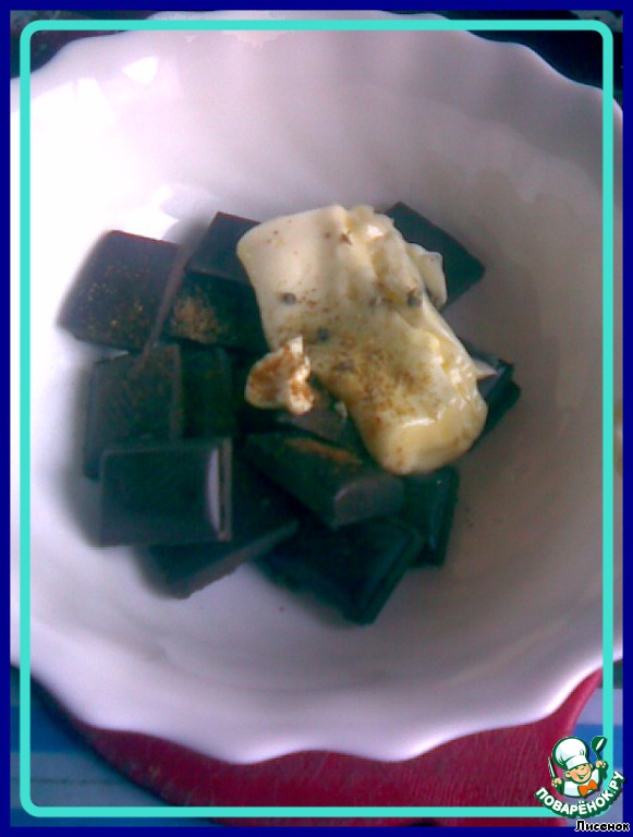 Шоколад ломаем на кусочки, добавляем пряности и масло.