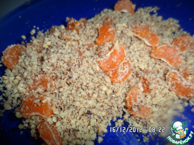 Орехи перемолоть, мандарины очистить и смешать с орехами. Шоколад растопить на водяной бане.