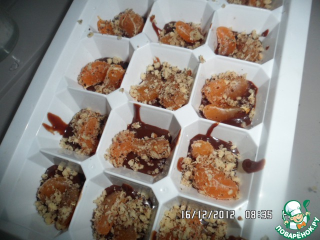 В формочки для льда налить немного шоколада и выложить начинку (мандарины с орешками).