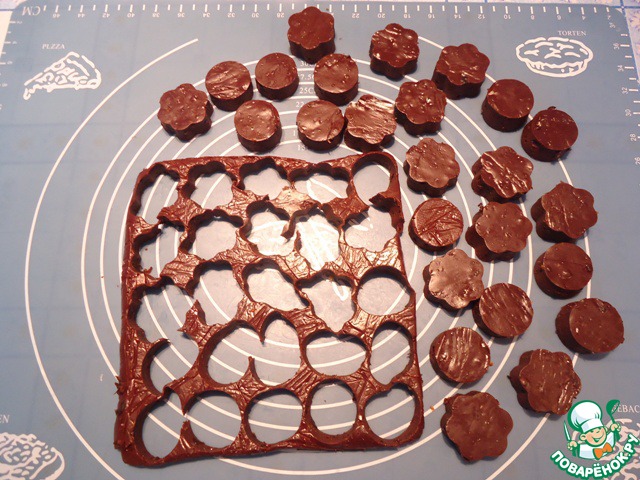 Достать застывшую массу из формы. С помощью вырубок вырезать конфеты.