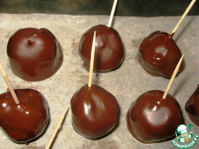 Растопить шоколад в микроволновке или на водяной бане. В каждый шарик воткнуть зубочистку и обмакнуть в шоколад.