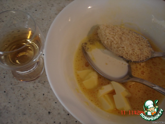 Желток взбить, добавить сливки, коньяк, миндаль, сливочное масло, хорошо перемешать.