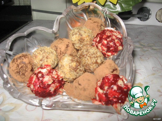 Достав из холодильника, формируем конфетки и обваливаем их в какао, другие - в вафельной крошке. Я делала еще красненькие: для этого в сахар добавляем немного розовой краски и капельку водички, окунаем конфетки в сахар, затем - в вафельную крошку.