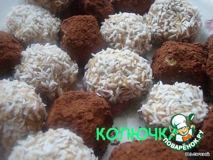 Делаем шарики и обволакиваем одни в какао, другие - в стружке и в сахарной пудре, и ставим в холодильник на пару часиков