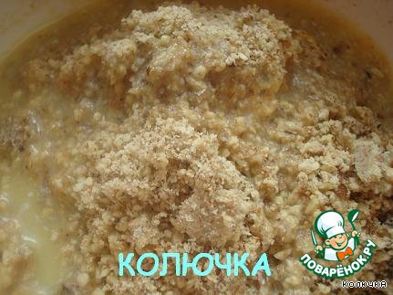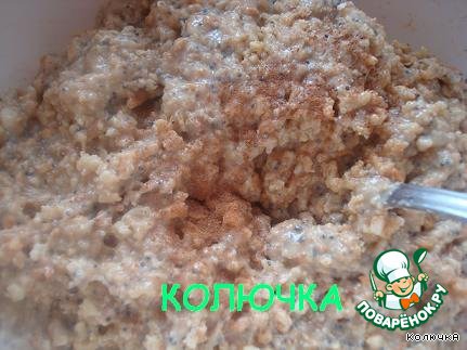В емкость выливаем сгущенку, добавляем печенье, мак, орехи, ванилин, корицу и начинаем мешать. Масса довольно густая. Растапливаем масло сливочное и добавляем туда же, чтобы масса стала не такая густая, и можно было формировать шарики.