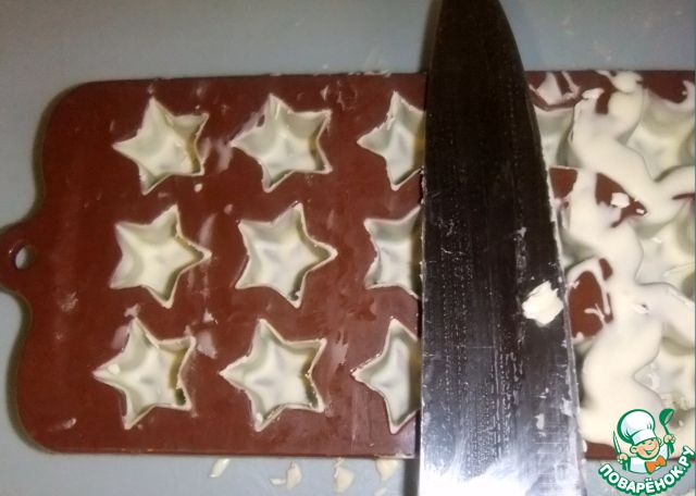 Снять излишки застывшего шоколада скребком или тупым ножом.