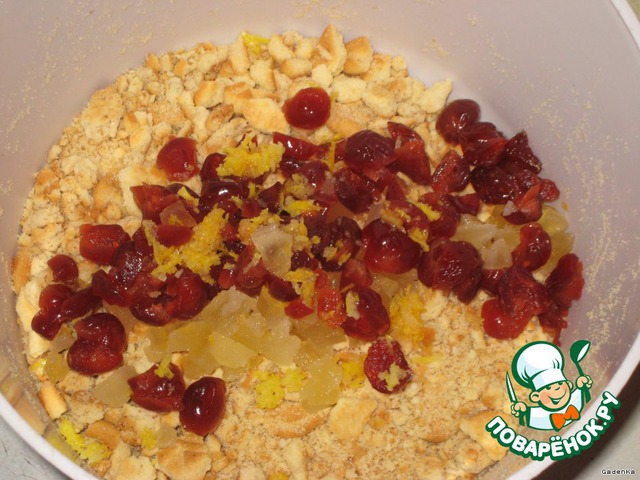 В раскрошенное печенье добавить порезанные цукаты, цедру, вылить карамель и перемешать.