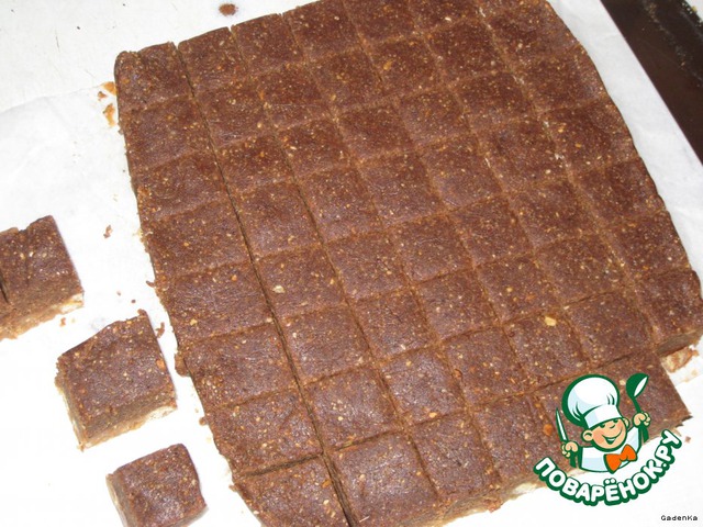 Когда смесь застынет, аккуратно вытащить ее за свешивающие концы бумаги, разрезать на квадратики желаемого размера. Я разрезала где-то 1,5х1,5 см, на один укус, чтобы сразу и всю в рот отправить )))