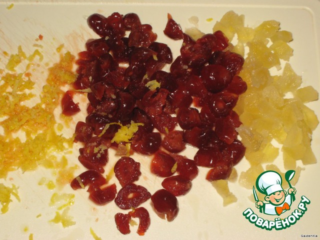 Вяленую черешню (цукаты) замочить в теплой воде, если твердые. Воду слить, порезать. У меня черешни было маловато, добавила вяленого ананаса немножко.