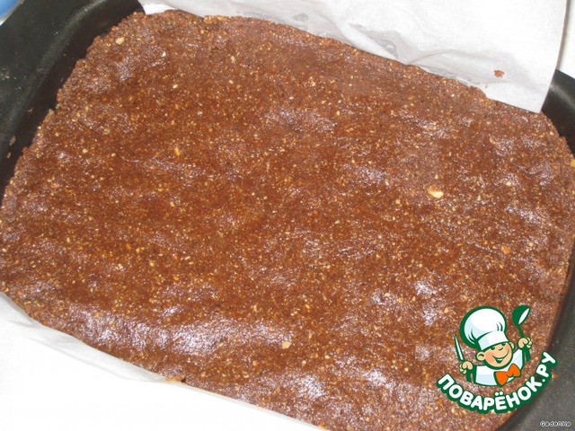 Прямоугольную форму выстелить пергаментной бумагой (или пленкой) так, чтобы концы свешивались наружу. Свободные края от бумаги смазать маслом.