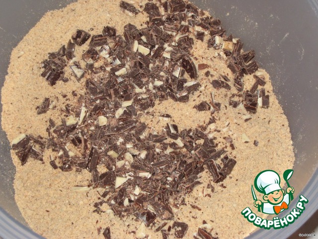 Шоколад порубить и добавить в семечно-мучную смесь. Я добавила еще немного белого шоколада.