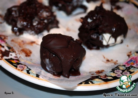 Снимаем шоколад с бани. Достаем мороженое. Вот теперь нужна ловкость рук и две ложки. Быстро окунаем мороженое в шоколад. Ап! От разницы температур он мгновенно застывает и превращается в корочку. Выкладываем обратно на пергамент и убираем в морозилку пока не растаяло.