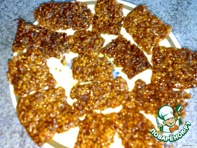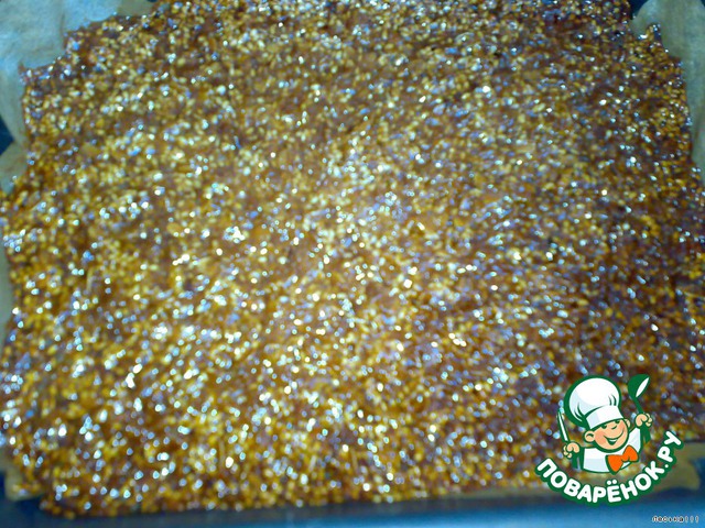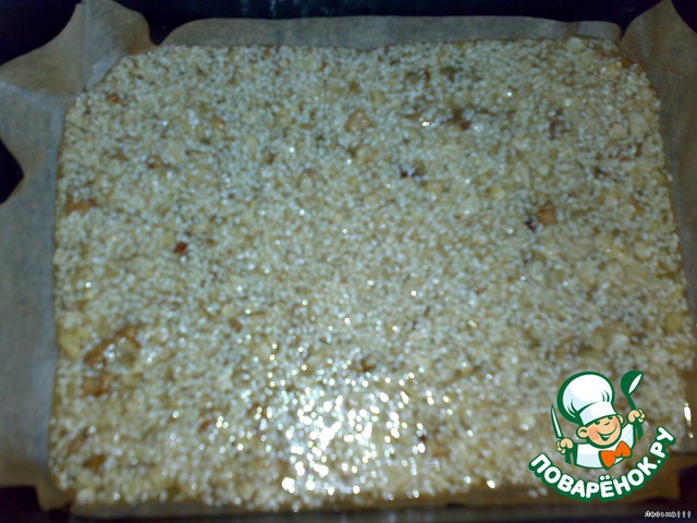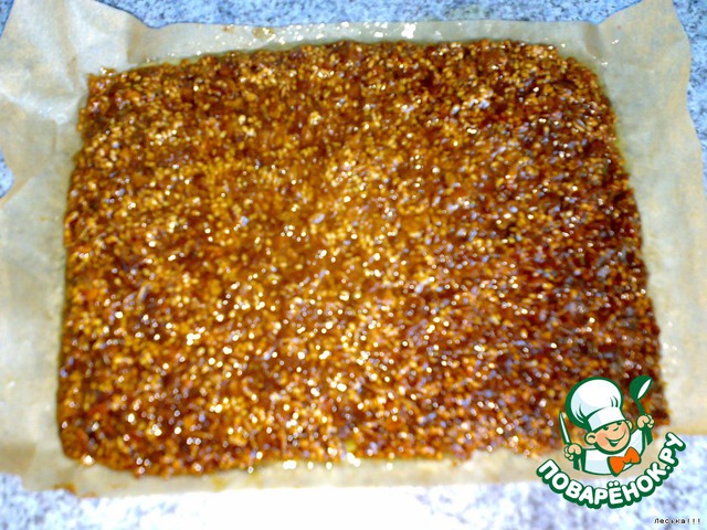 Снять с огня и добавить кунжут, рубленные орехи и овсяные хлопья. Размешать тщательно