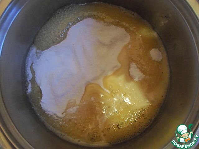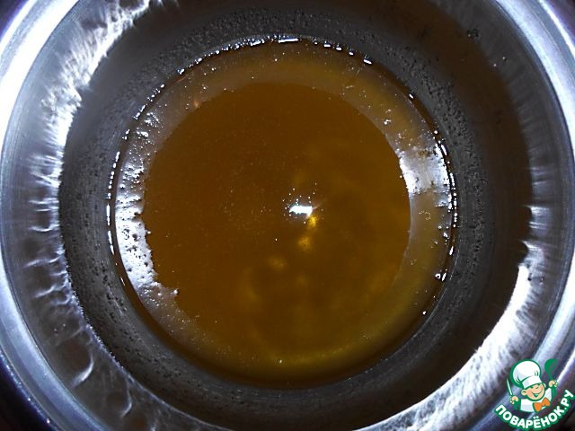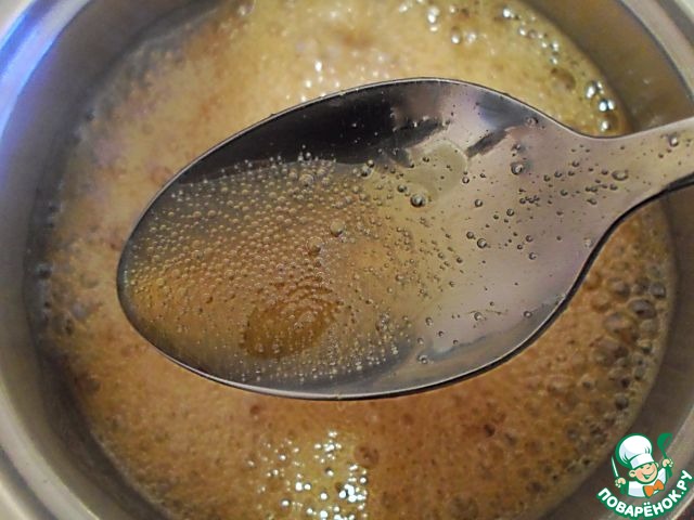 Дальше при использовании сиропа глюкозы надо, также не помешивая, довести смесь до глубокого янтарного оттенка. Но мед, как Вы понимаете, изначально непрозрачный, в этом плане совершенно особый случай, поэтому я подержала его на огне то время, за которое, на мой взгляд, может карамелизироваться сироп глюкозы.