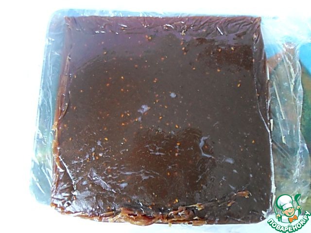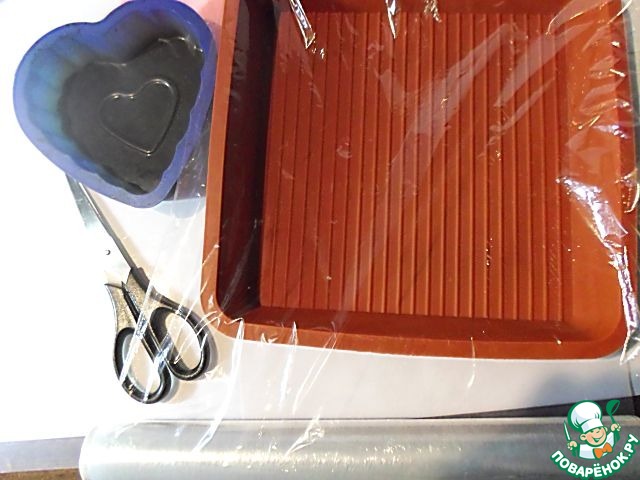 Форму диаметром около 20 см застилаем пищевой пленкой и выливаем в нее полученную карамель. Остужаем до комнатной температуры и убираем на ночь в холодильник.