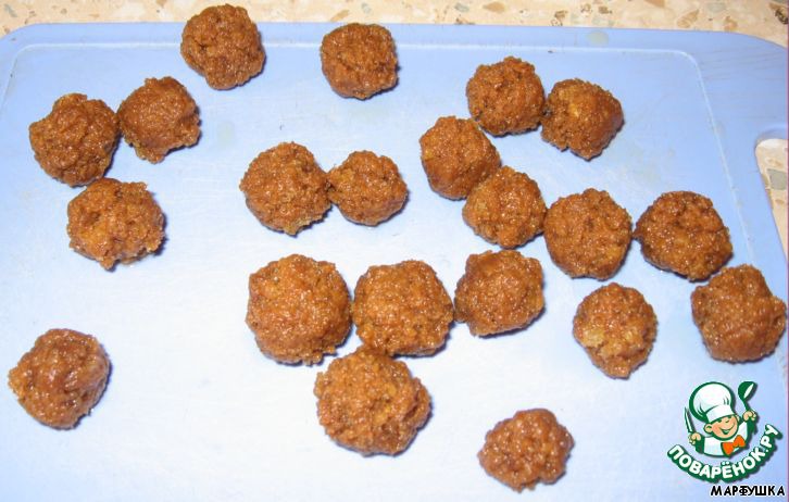 Вот такие шарики получились у меня, затем их можно обвалять в кокосовой стружке (тут тоже надо обваливать в стружке, пока они теплые).